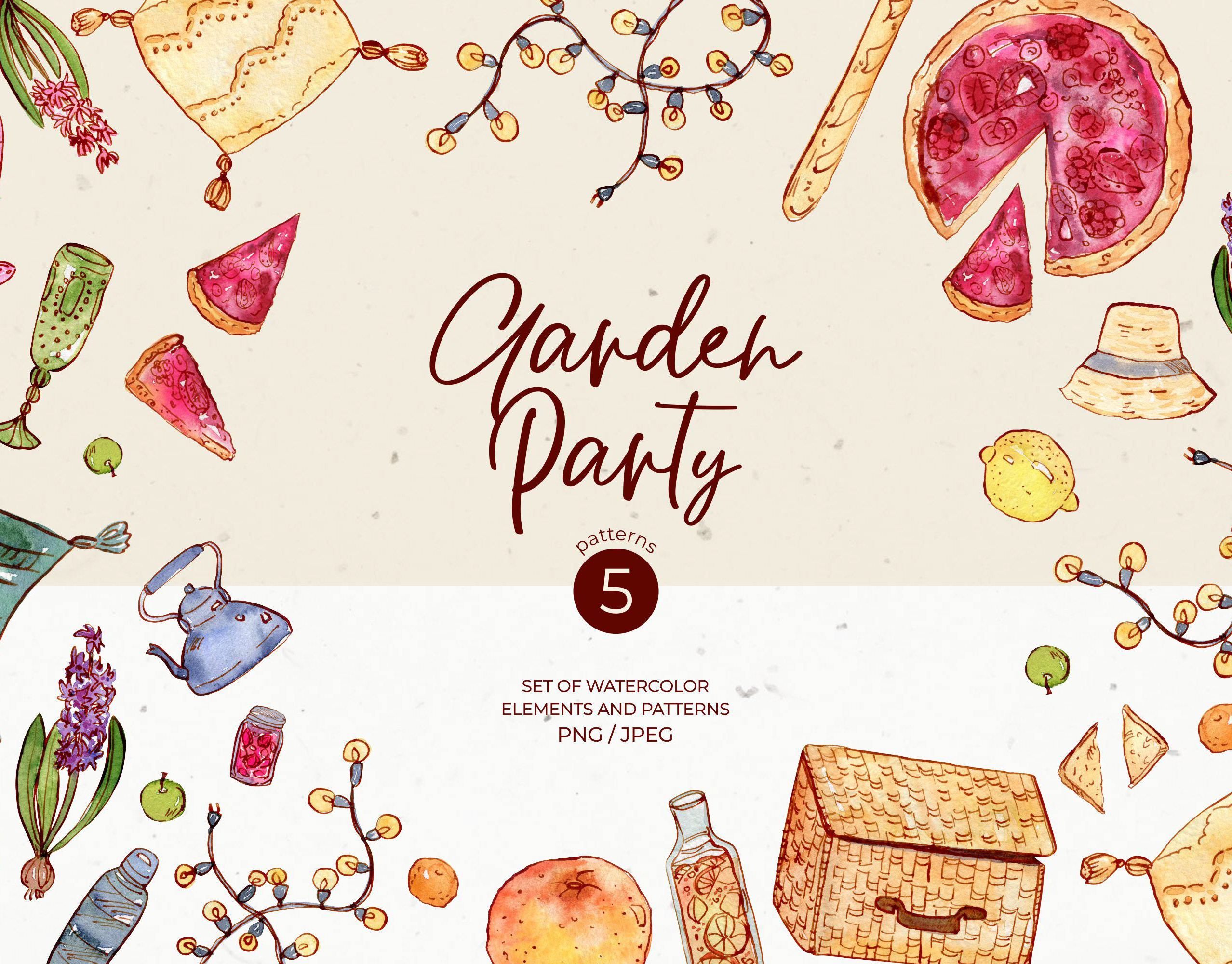 Garden party: watercolor & ink elements and patterns