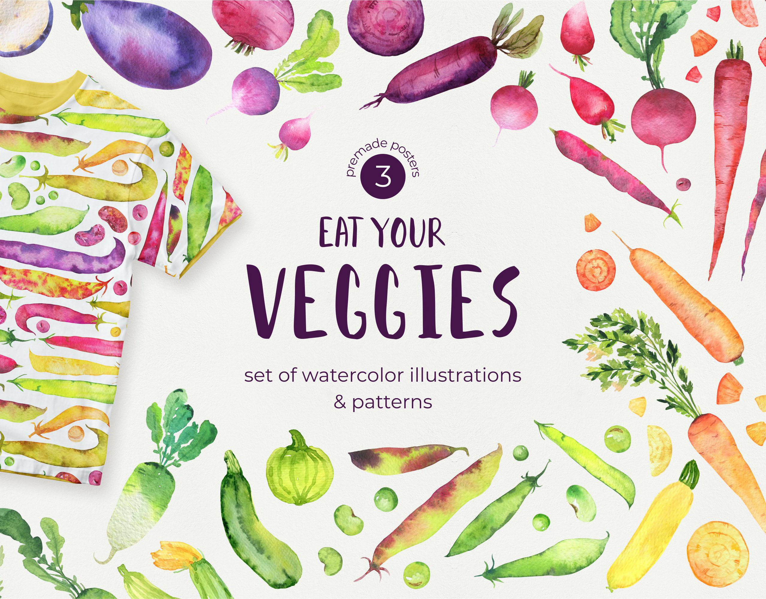 Eat your veggies. Watercolor illustrations and patterns