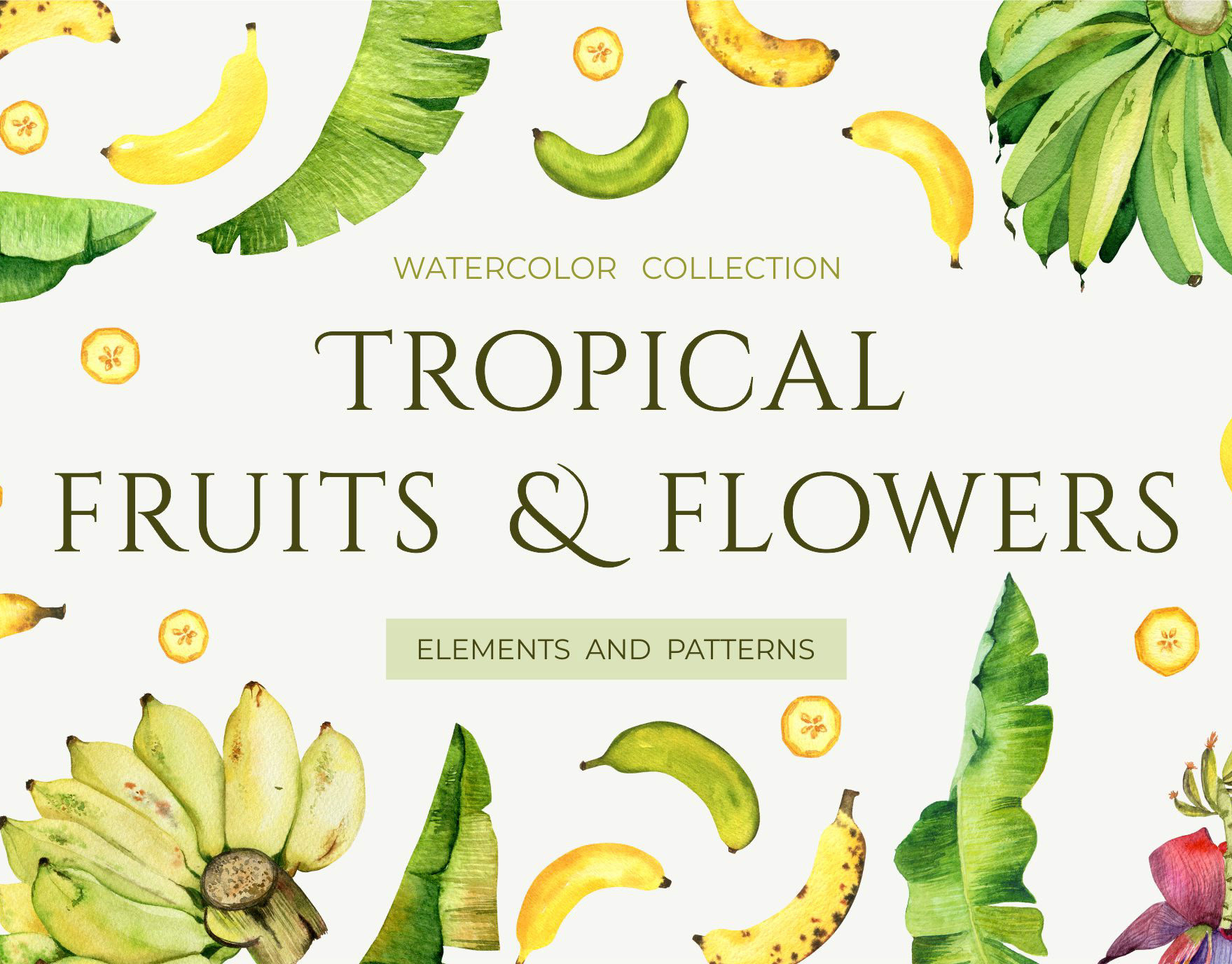 Watercolor set of fruit and leaves of banana