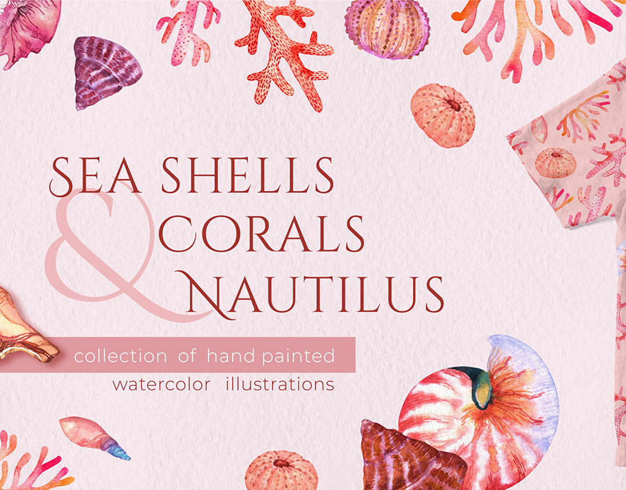 Watercolor collection of hand painted seashells