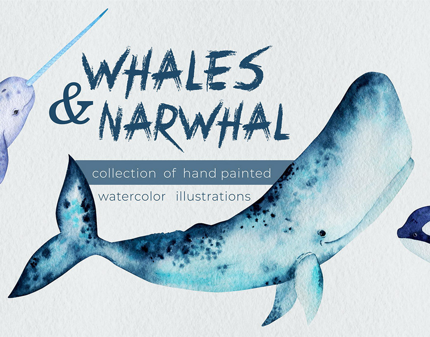 Whales and narwhal watercolor pattern